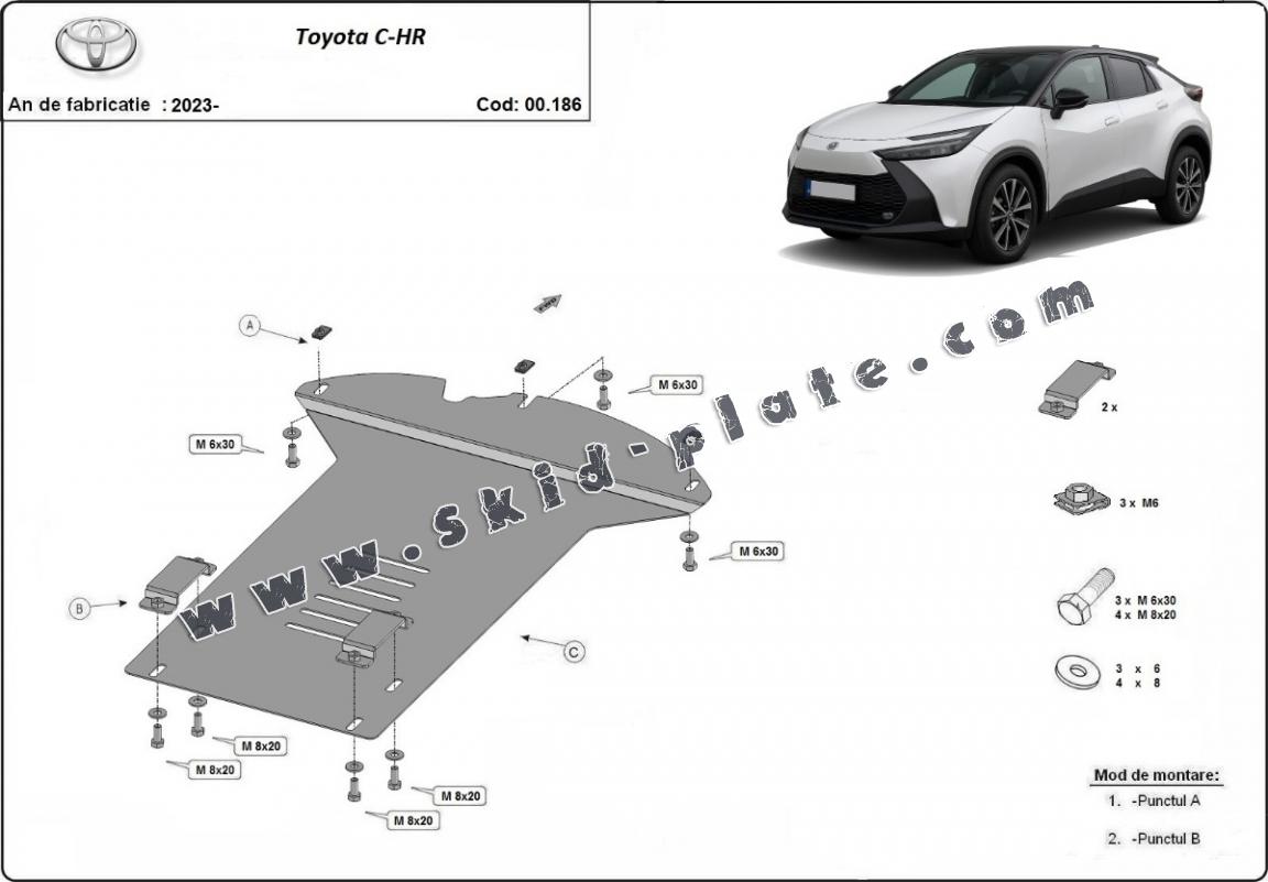 Skid plate for the protection of the: Catalytic converter The skid plate is new and fits perfectly for all versions of Toyota C-HR manufactured between 2023 and 2026. Made out of 2 mm thick Steel plate. Screws, nuts, clips, all fastening accessories are included. All skid plates are powder coated to prevent corrosion. The exterior of the skid plate is provided with Steel reinforcements, which increases the resistance to impact. |