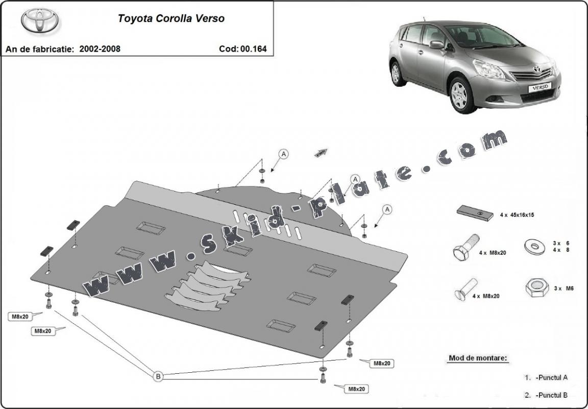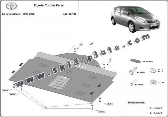 Skid plate for the protection of the: Catalytic converter The skid plate is new and fits perfectly for all versions of Toyota Corolla Verso manufactured between 2002 and 2008. Made out of 2 mm thick Steel plate. Screws, nuts, clips, all fastening accessories are included. All skid plates are powder coated to prevent corrosion. The exterior of the skid plate is provided with Steel reinforcements, which increases the resistance to impact. |