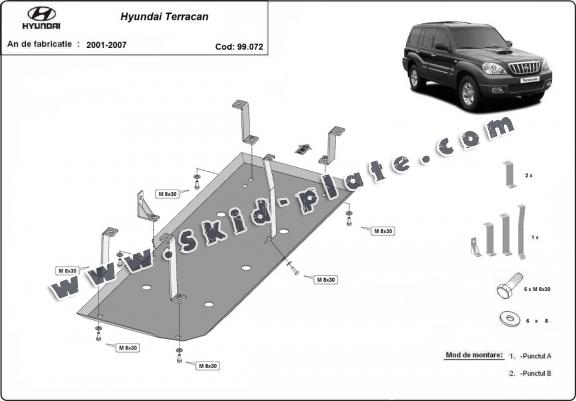 Skid plate for the protection of the: fuel tank The skid plate is new and fits perfectly for all versions of Hyundai Terracan manufactured between 2001 and 2007. Made out of 2 mm thick Steel plate. Screws, nuts, clips, all fastening accessories are included. All skid plates are powder coated to prevent corrosion. The exterior of the skid plate is provided with Steel reinforcements, which increases the resistance to impact. |