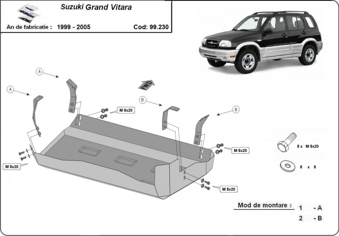 Skid plate for the protection of the: fuel tank The skid plate is new and fits perfectly for all versions of Suzuki Grand Vitara manufactured between 1999 and 2005. Made out of 2 mm thick Steel plate. Screws, nuts, clips, all fastening accessories are included. All skid plates are powder coated to prevent corrosion. The exterior of the skid plate is provided with Steel reinforcements, which increases the resistance to impact. |