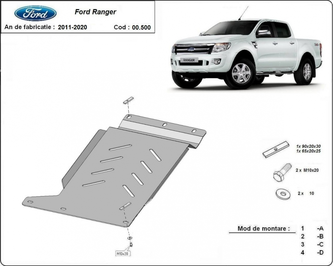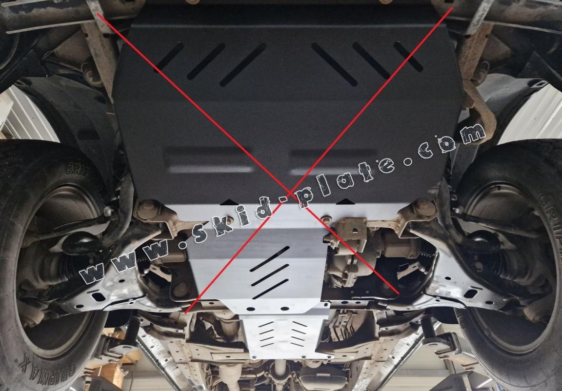 Skid plate for the protection of the: gearbox The skid plate is new and fits perfectly for all versions of Ford Ranger manufactured between 2011 and 2020. Made out of 3 mm thick Steel plate. Screws, nuts, clips, all fastening accessories are included. All skid plates are powder coated to prevent corrosion. The exterior of the skid plate is provided with Steel reinforcements, which increases the resistance to impact. |