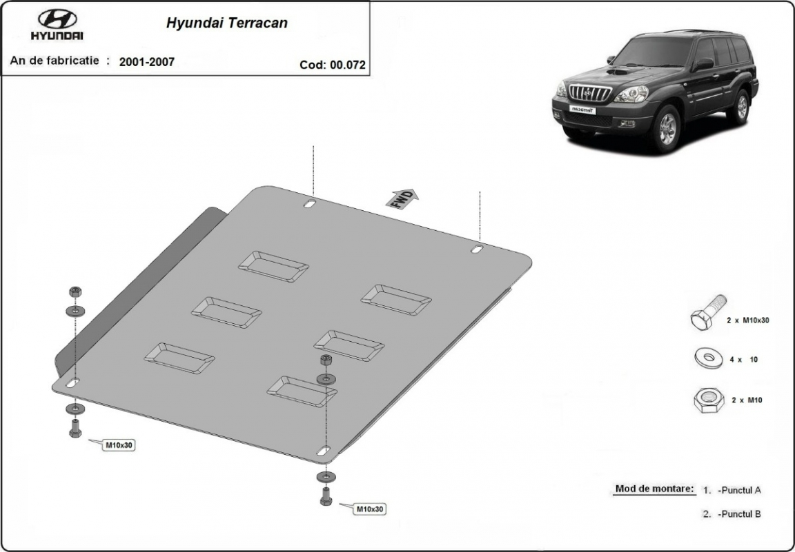 Skid plate for the protection of the: gearbox The skid plate is new and fits perfectly for all versions of Hyundai Terracan manufactured between 2001 and 2007. Made out of 2.5 mm thick Steel plate. Screws, nuts, clips, all fastening accessories are included. All skid plates are powder coated to prevent corrosion. The exterior of the skid plate is provided with Steel reinforcements, which increases the resistance to impact. |