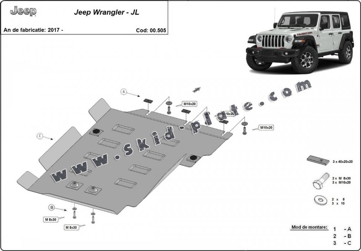 Skid plate for the protection of the: gearbox The skid plate is new and fits perfectly for all versions of Jeep Wrangler manufactured between 2017 and 2026. Made out of 2 mm thick Steel plate. Screws, nuts, clips, all fastening accessories are included. All skid plates are powder coated to prevent corrosion. The exterior of the skid plate is provided with Steel reinforcements, which increases the resistance to impact. |