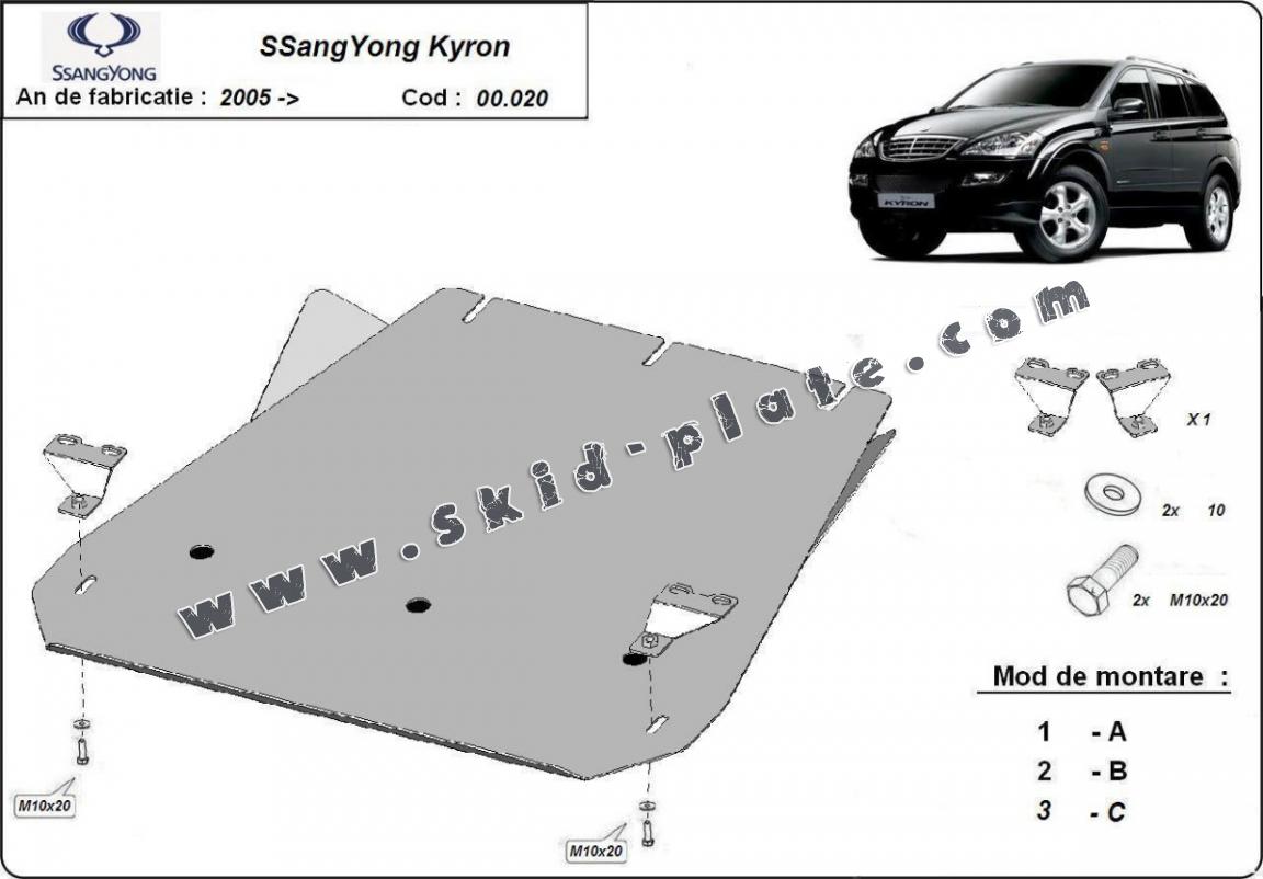The skid plate is new and fits perfectly for the SsangYong Kyron, with the following engine/drive versions: 2.0 Xdi ; 2.7Xdi ; 3.2 ; 2.3 - manufactured between 2005 and 2014.