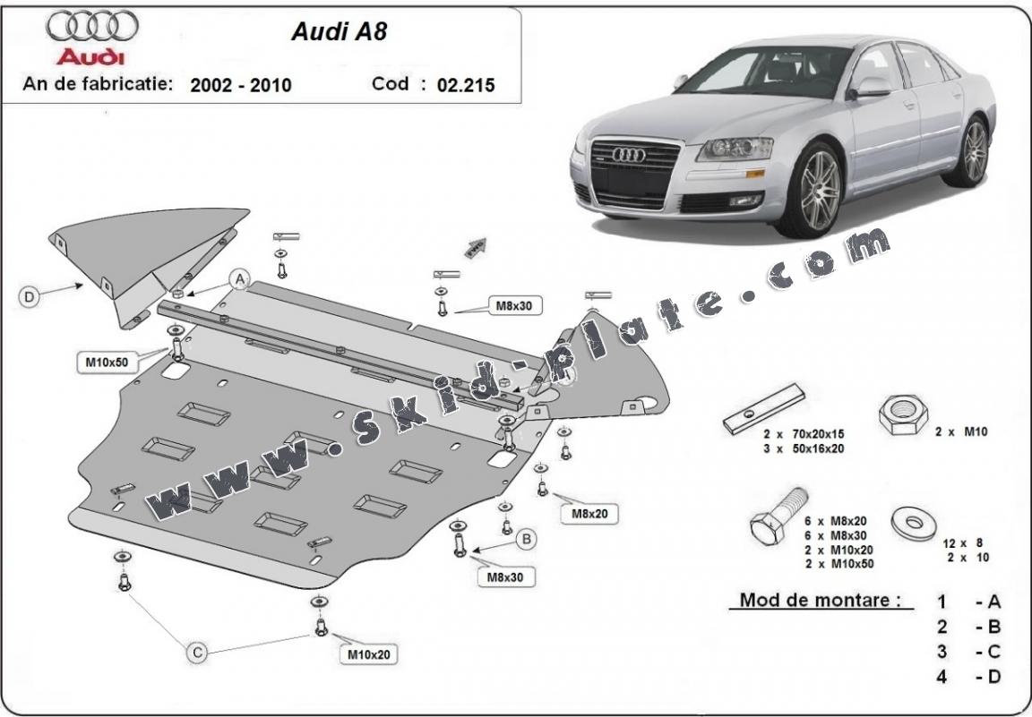 The skid plate is new and fits perfectly for all versions of Audi A8 manufactured between 2002 and 2010.