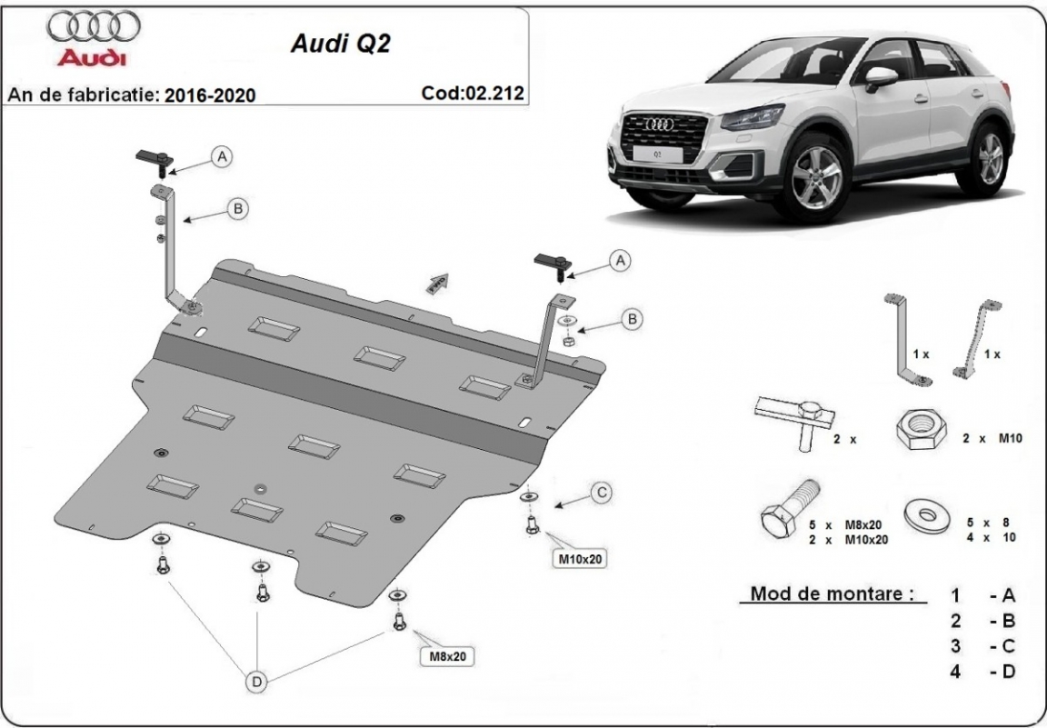 Skid plate for the protection of the: engine, gearbox, radiator The skid plate is new and fits perfectly for all versions of Audi Q2 manufactured between 2016 and 2020. Made out of 2 mm thick Steel plate. Screws, nuts, clips, all fastening accessories are included. All skid plates are powder coated to prevent corrosion. The exterior of the skid plate is provided with Steel reinforcements, which increases the resistance to impact. |