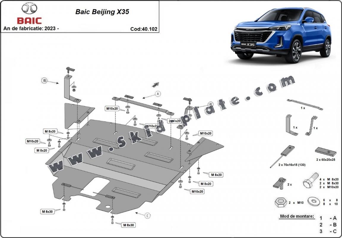 The skid plate is new and fits perfectly for all versions of Baic Beijing X35 manufactured between 2023 and 2026.
