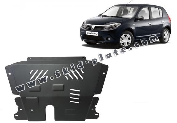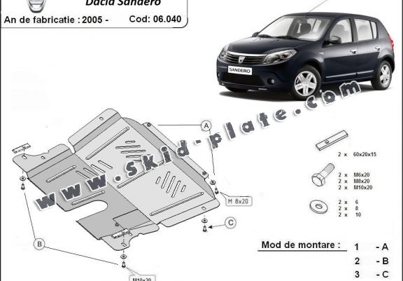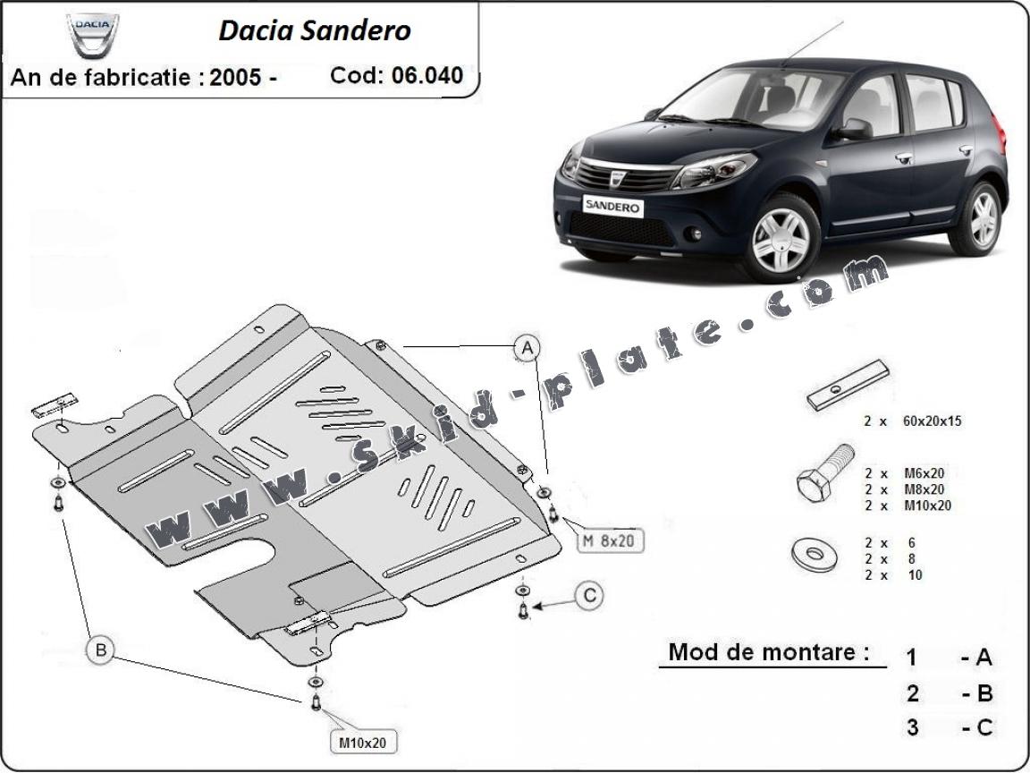 Skid plate for the protection of the: engine, gearbox, radiator, front bumper The skid plate is new and fits perfectly for all versions of Dacia Sandero manufactured between 2005 and 2012. Made out of 2 mm thick Steel plate. Screws, nuts, clips, all fastening accessories are included. All skid plates are powder coated to prevent corrosion. The exterior of the skid plate is provided with Steel reinforcements, which increases the resistance to impact. |