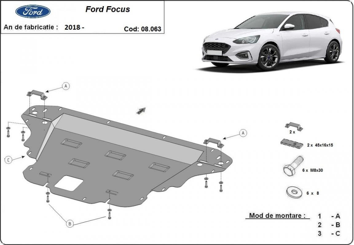 Skid plate for the protection of the: engine, gearbox, radiator, front bumper The skid plate is new and fits perfectly for all versions of Ford Focus 4 manufactured between 2018 and 2026. Made out of 2 mm thick Steel plate. Screws, nuts, clips, all fastening accessories are included. All skid plates are powder coated to prevent corrosion. The exterior of the skid plate is provided with Steel reinforcements, which increases the resistance to impact. |