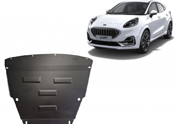Skid plate for the protection of the: engine, gearbox, radiator The skid plate is new and fits perfectly for all versions of Ford Puma manufactured between 2019 and 2026. Made out of 2 mm thick Steel plate. Screws, nuts, clips, all fastening accessories are included. All skid plates are powder coated to prevent corrosion. The exterior of the skid plate is provided with Steel reinforcements, which increases the resistance to impact. |