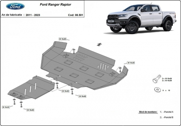Skid plate for the protection of the: engine, front bumper The skid plate is new and fits perfectly for all versions of Ford Ranger Raptor manufactured between 2020 and 2023. Made out of 3 mm thick Steel plate. Screws, nuts, clips, all fastening accessories are included. All skid plates are powder coated to prevent corrosion. The exterior of the skid plate is provided with Steel reinforcements, which increases the resistance to impact. |