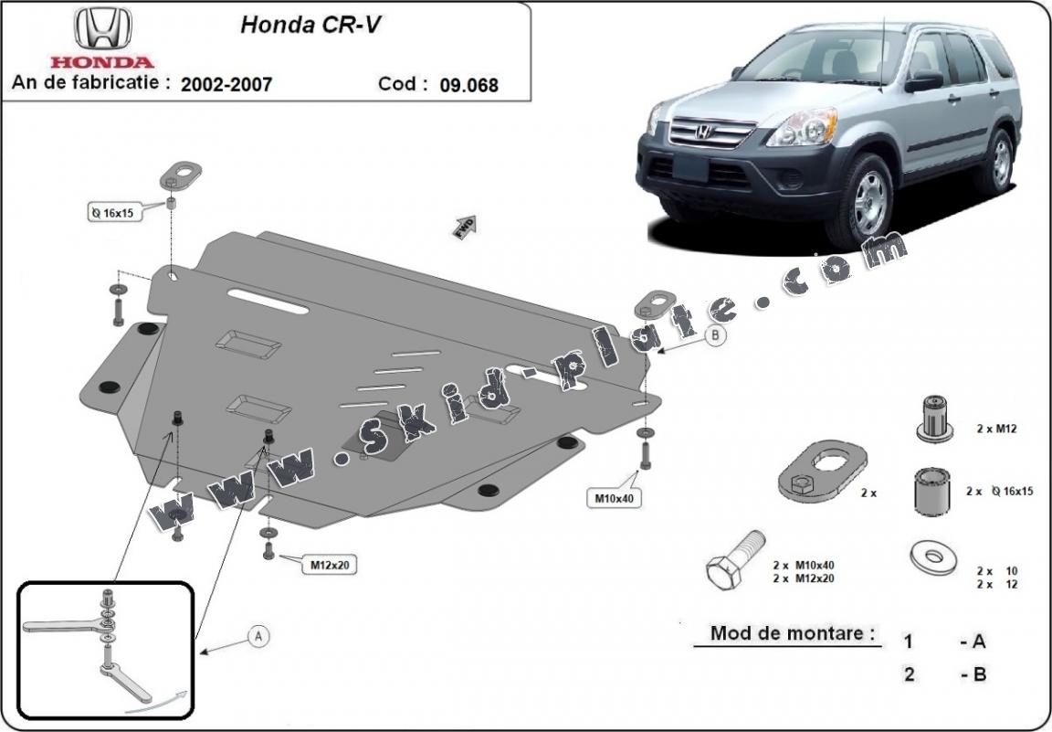Skid plate for the protection of the: engine, radiator The skid plate is new and fits perfectly for all versions of Honda CR-V manufactured between 2002 and 2007. Made out of 2.5 mm thick Steel plate. Screws, nuts, clips, all fastening accessories are included. All skid plates are powder coated to prevent corrosion. The exterior of the skid plate is provided with Steel reinforcements, which increases the resistance to impact. |