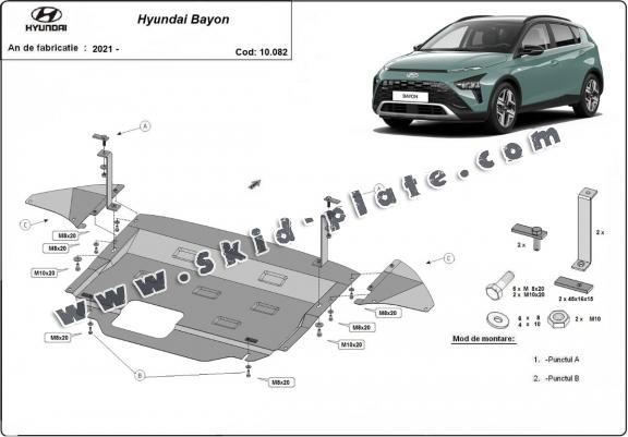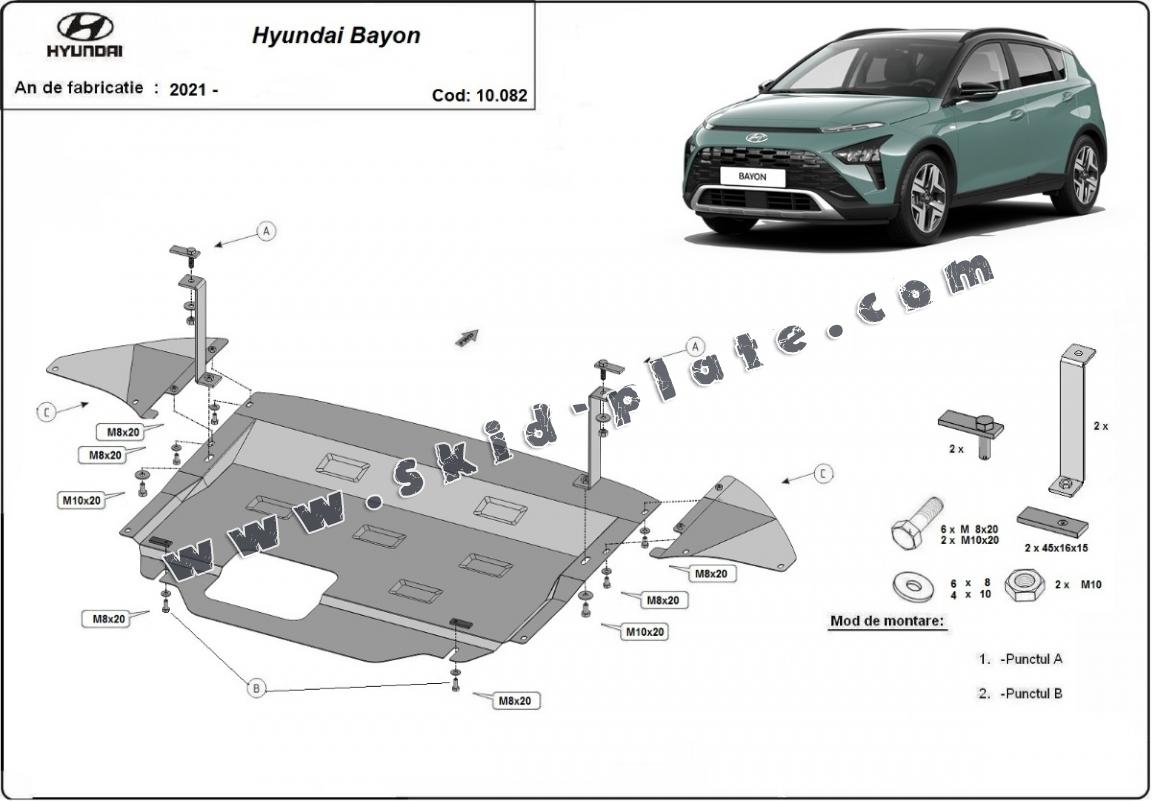 Skid plate for the protection of the: engine, gearbox, radiator, front bumper The skid plate is new and fits perfectly for all versions of Hyundai Bayon manufactured between 2021 and 2026. Made out of mm thick Steel plate. Screws, nuts, clips, all fastening accessories are included. All skid plates are powder coated to prevent corrosion. The exterior of the skid plate is provided with Steel reinforcements, which increases the resistance to impact. |