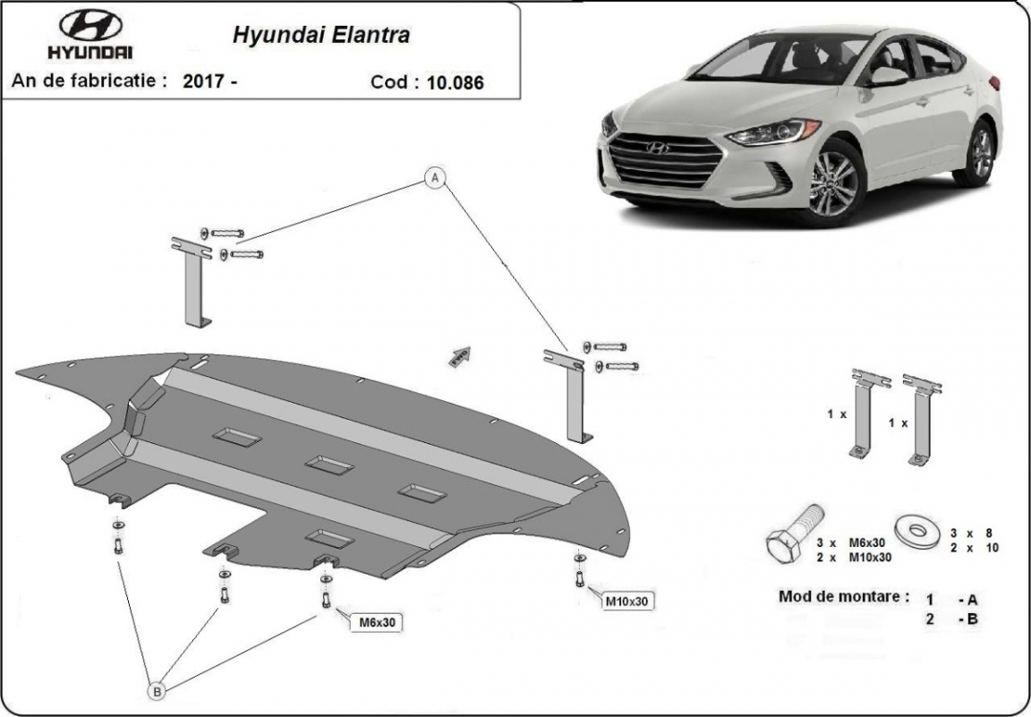 Skid plate for the protection of the: engine, gearbox, radiator, front bumper The skid plate is new and fits perfectly for all versions of Hyundai Elantra manufactured between 2016 and 2020. Made out of 2 mm thick Steel plate. Screws, nuts, clips, all fastening accessories are included. All skid plates are powder coated to prevent corrosion. The exterior of the skid plate is provided with Steel reinforcements, which increases the resistance to impact. |