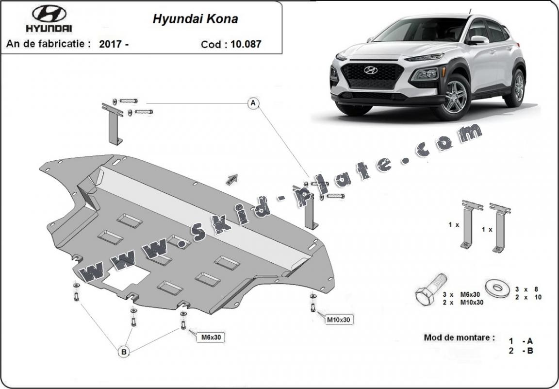 Skid plate for the protection of the: engine, gearbox, radiator, front bumper The skid plate is new and fits perfectly for all versions of Hyundai Kona manufactured between 2017 and 2023. Made out of 2 mm thick Steel plate. Screws, nuts, clips, all fastening accessories are included. All skid plates are powder coated to prevent corrosion. The exterior of the skid plate is provided with Steel reinforcements, which increases the resistance to impact. |