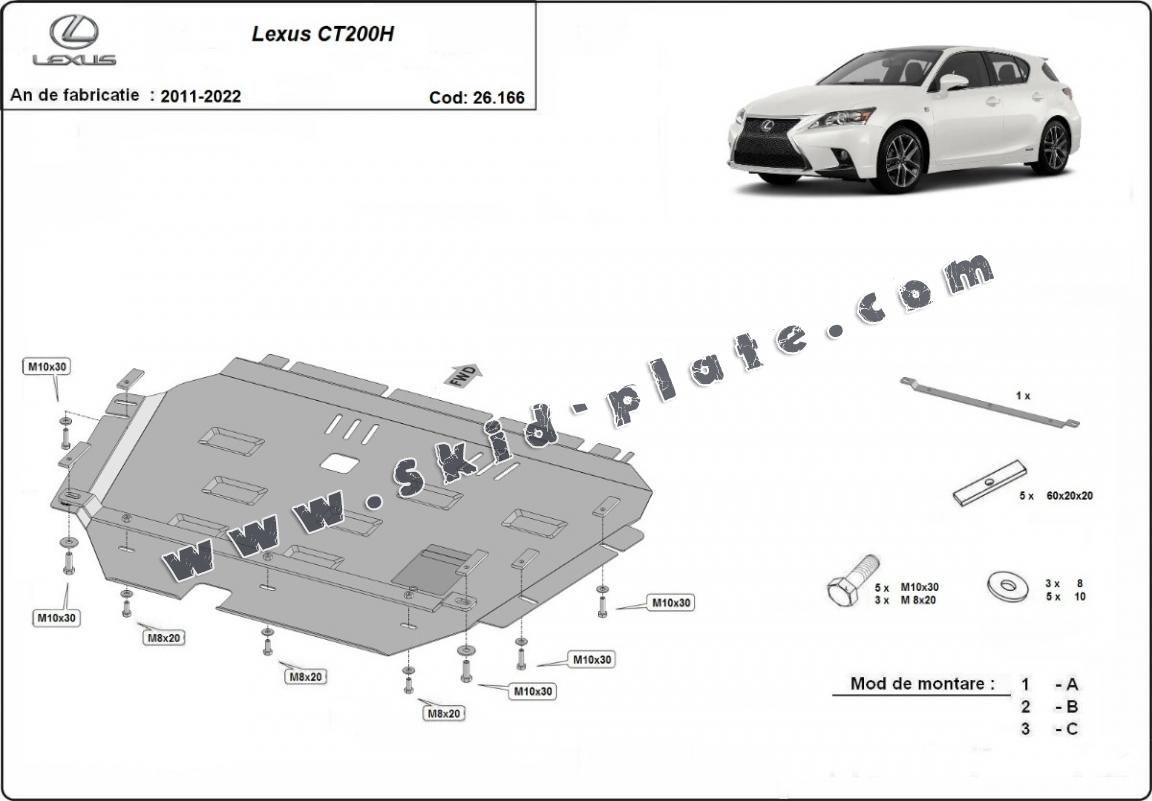 Skid plate for the protection of the: engine, gearbox, radiator The skid plate is new and fits perfectly for all versions of Lexus CT200H manufactured between 2011 and 2022. Made out of 2 mm thick Steel plate. Screws, nuts, clips, all fastening accessories are included. All skid plates are powder coated to prevent corrosion. The exterior of the skid plate is provided with Steel reinforcements, which increases the resistance to impact. |