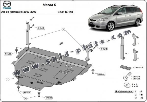 Skid plate for the protection of the: engine, gearbox, radiator The skid plate is new and fits perfectly for all versions of Mazda 5 manufactured between 2003 and 2009. Made out of 2 mm thick Steel plate. Screws, nuts, clips, all fastening accessories are included. All skid plates are powder coated to prevent corrosion. The exterior of the skid plate is provided with Steel reinforcements, which increases the resistance to impact. |