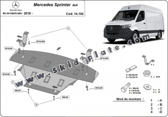 Skid plate for the protection of the: engine, gearbox, radiator, front bumper The skid plate is new and fits perfectly for the Mercedes Sprinter 4x4, with the following engine/drive versions: 4x4 - manufactured between 2018 and 2023. Made out of 2 mm thick Steel plate. Screws, nuts, clips, all fastening accessories are included. All skid plates are powder coated to prevent corrosion. The exterior of the skid plate is provided with Steel reinforcements, which increases the resistance to impact. |