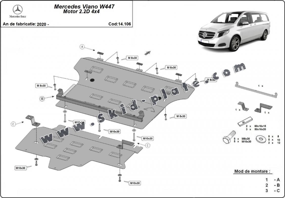 The skid plate is new and fits perfectly for the Mercedes Viano W447, with the following engine/drive versions: 2.0, 2.2 D, 4x4 - manufactured between 2020 and 2026.