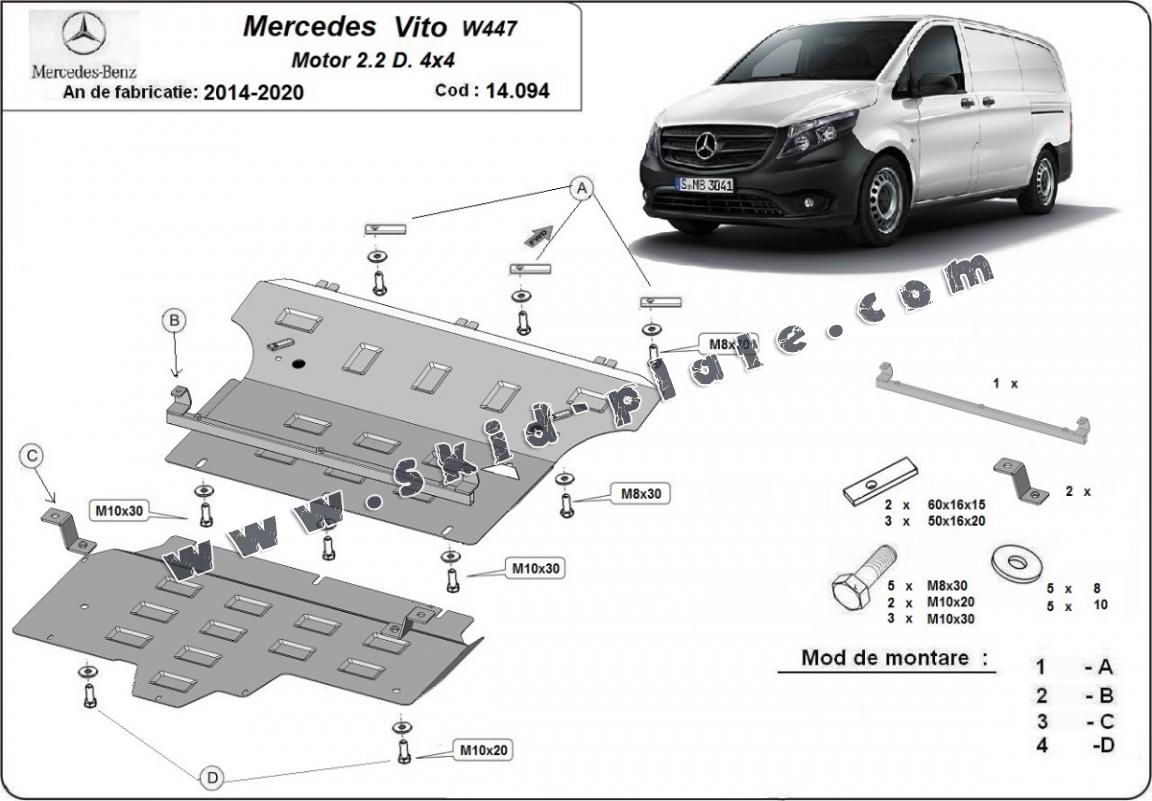 | The skid plate is new and fits perfectly for the Mercedes Vito W447, with the following engine/drive versions: 2.0, 2.2 D, 4x4 - manufactured between 2014 and 2020. |