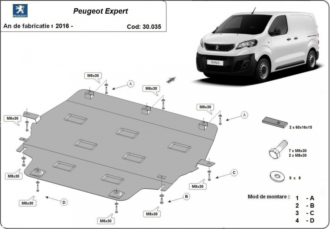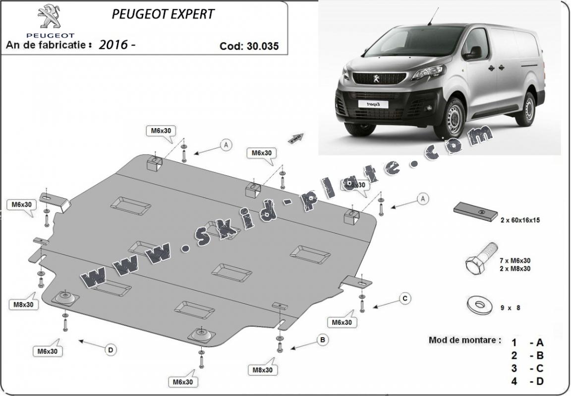 Skid plate for the protection of the: engine, gearbox, radiator The skid plate is new and fits perfectly for all versions of Peugeot Expert manufactured between 2016 and 2026. Made out of 2 mm thick Steel plate. Screws, nuts, clips, all fastening accessories are included. All skid plates are powder coated to prevent corrosion. The exterior of the skid plate is provided with Steel reinforcements, which increases the resistance to impact. |