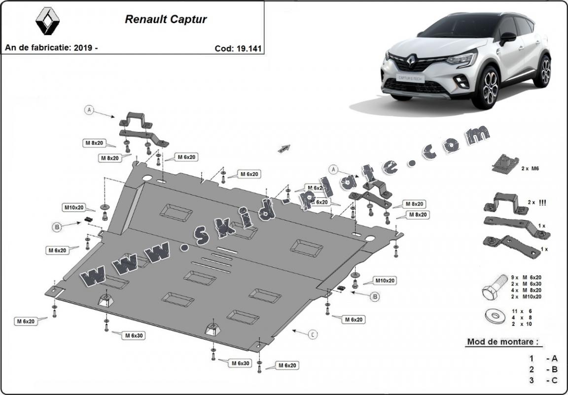 Skid plate for the protection of the: engine, gearbox, radiator The skid plate is new and fits perfectly for all versions of Renault Captur manufactured between 2019 and 2026. Made out of 2 mm thick Steel plate. Screws, nuts, clips, all fastening accessories are included. All skid plates are powder coated to prevent corrosion. The exterior of the skid plate is provided with Steel reinforcements, which increases the resistance to impact. |