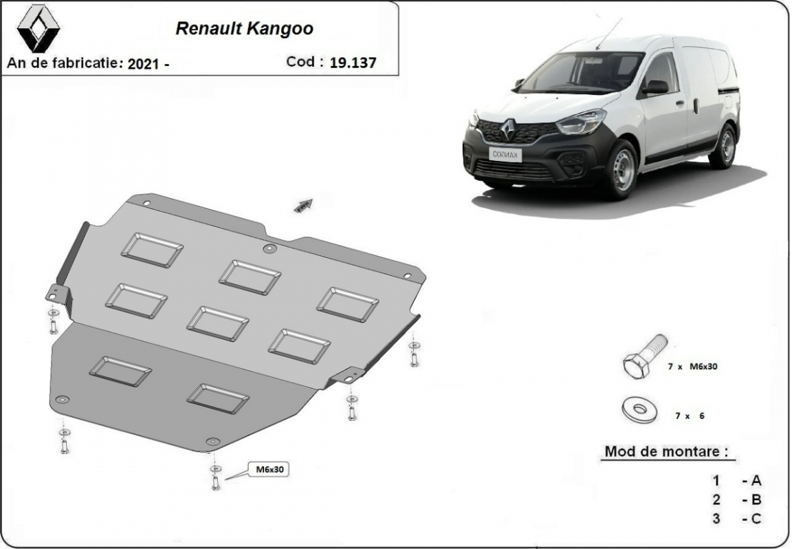 Skid plate for the protection of the: engine, gearbox The skid plate is new and fits perfectly for all versions of Renault Kangoo manufactured between 2021 and 2026. Made out of 2 mm thick Steel plate. Screws, nuts, clips, all fastening accessories are included. All skid plates are powder coated to prevent corrosion. The exterior of the skid plate is provided with Steel reinforcements, which increases the resistance to impact. |
