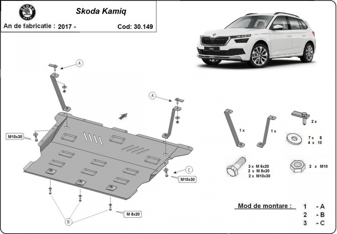 Skid plate for the protection of the: engine, gearbox, radiator, front bumper The skid plate is new and fits perfectly for all versions of Skoda Kamiq manufactured between 2019 and 2026. Made out of 2 mm thick Steel plate. Screws, nuts, clips, all fastening accessories are included. All skid plates are powder coated to prevent corrosion. The exterior of the skid plate is provided with Steel reinforcements, which increases the resistance to impact. |