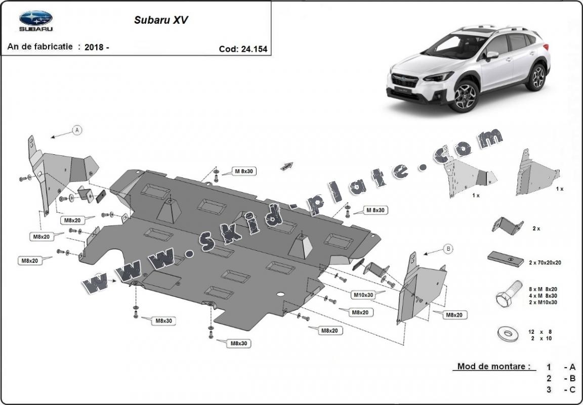 Skid plate for the protection of the: engine, radiator The skid plate is new and fits perfectly for all versions of Subaru XV manufactured between 2018 and 2022. Made out of 2 mm thick Steel plate. Screws, nuts, clips, all fastening accessories are included. All skid plates are powder coated to prevent corrosion. The exterior of the skid plate is provided with Steel reinforcements, which increases the resistance to impact. |