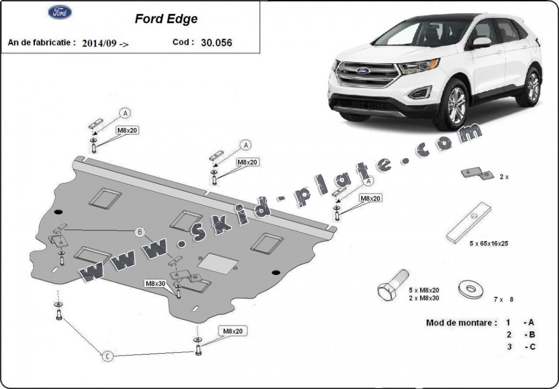 Skid plate for the protection of the: engine, gearbox, radiator The skid plate is new and fits perfectly for all versions of Ford Edge manufactured between 2014 and 2021. Made out of 2 mm thick Steel plate. Screws, nuts, clips, all fastening accessories are included. All skid plates are powder coated to prevent corrosion. The exterior of the skid plate is provided with Steel reinforcements, which increases the resistance to impact. |