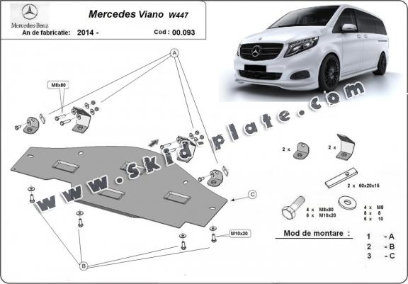 The skid plate is new and fits perfectly for the Mercedes Viano W447 4x2, 1.6 D, with the following engine/drive versions: 4x2, 1.6 D - manufactured between 2014 and 2020.
