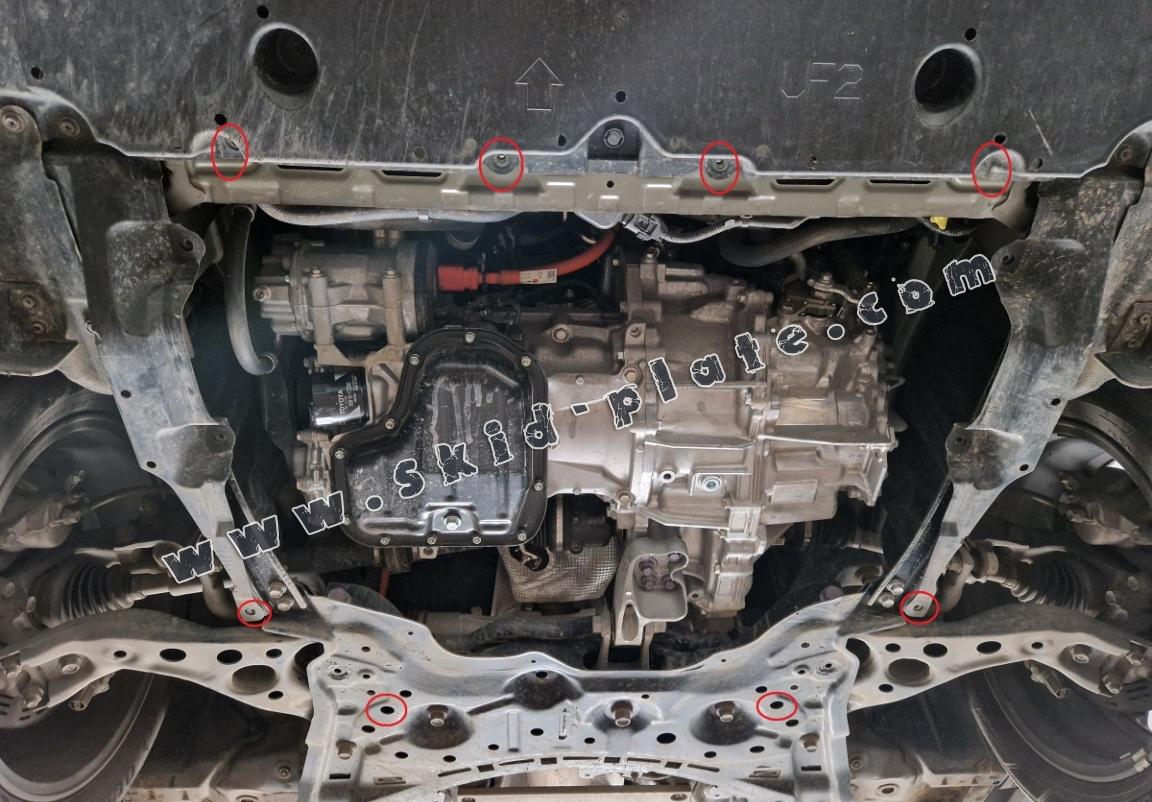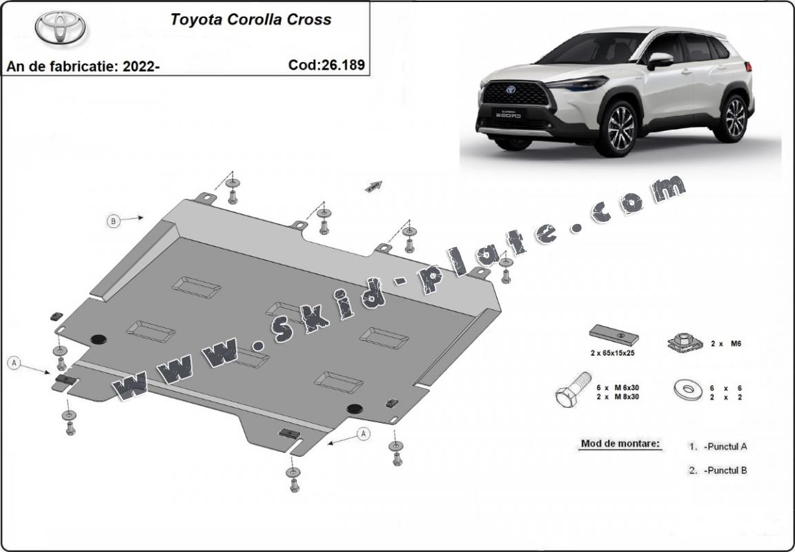 Skid plate for the protection of the: engine, gearbox, radiator The skid plate is new and fits perfectly for all versions of Toyota Corolla Cross manufactured between 2022 and 2026. Made out of 2 mm thick Steel plate. Screws, nuts, clips, all fastening accessories are included. All skid plates are powder coated to prevent corrosion. The exterior of the skid plate is provided with Steel reinforcements, which increases the resistance to impact. |