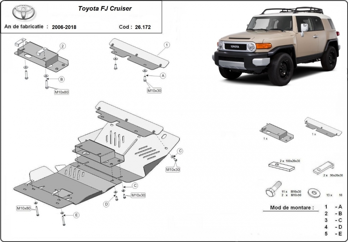 Skid plate for the protection of the: engine, radiator, front bumper The skid plate is new and fits perfectly for all versions of Toyota Fj Cruiser manufactured between 2006 and 2018. Made out of 2.5 mm thick Steel plate. Screws, nuts, clips, all fastening accessories are included. All skid plates are powder coated to prevent corrosion. The exterior of the skid plate is provided with Steel reinforcements, which increases the resistance to impact. |