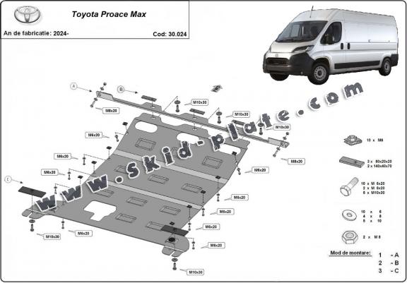 The skid plate is new and fits perfectly for all versions of Toyota Proace Max manufactured between 2024 and 2026.