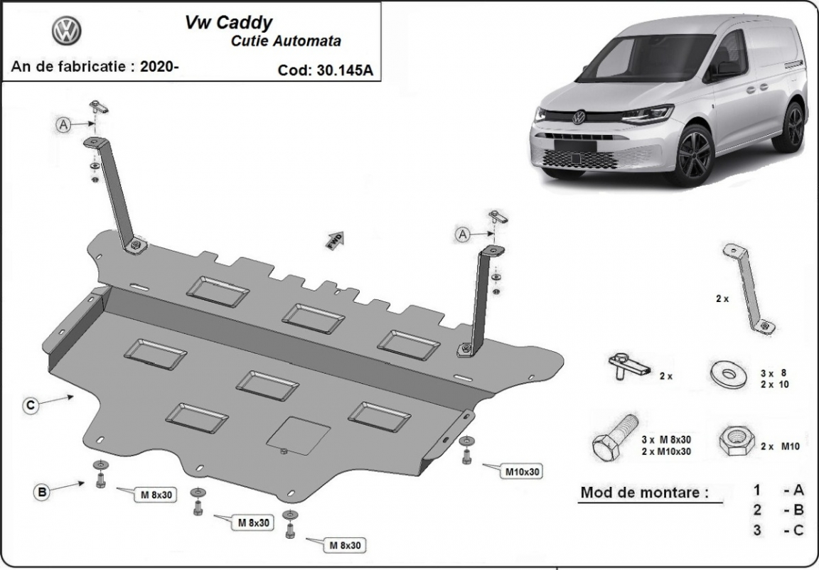 Skid plate for the protection of the: engine, gearbox, radiator, front bumper The skid plate is new and fits perfectly for all versions of VW Caddy manufactured between 2020 and 2026. Made out of 2 mm thick Steel plate. Screws, nuts, clips, all fastening accessories are included. All skid plates are powder coated to prevent corrosion. The exterior of the skid plate is provided with Steel reinforcements, which increases the resistance to impact. |