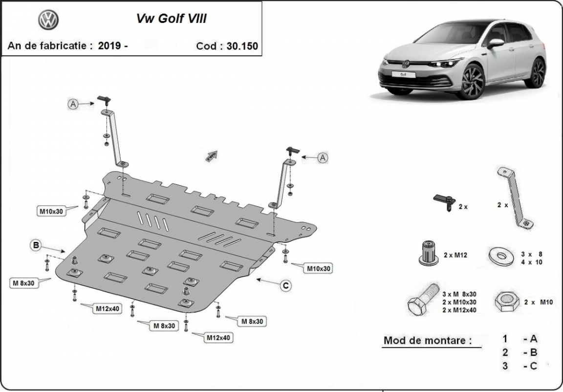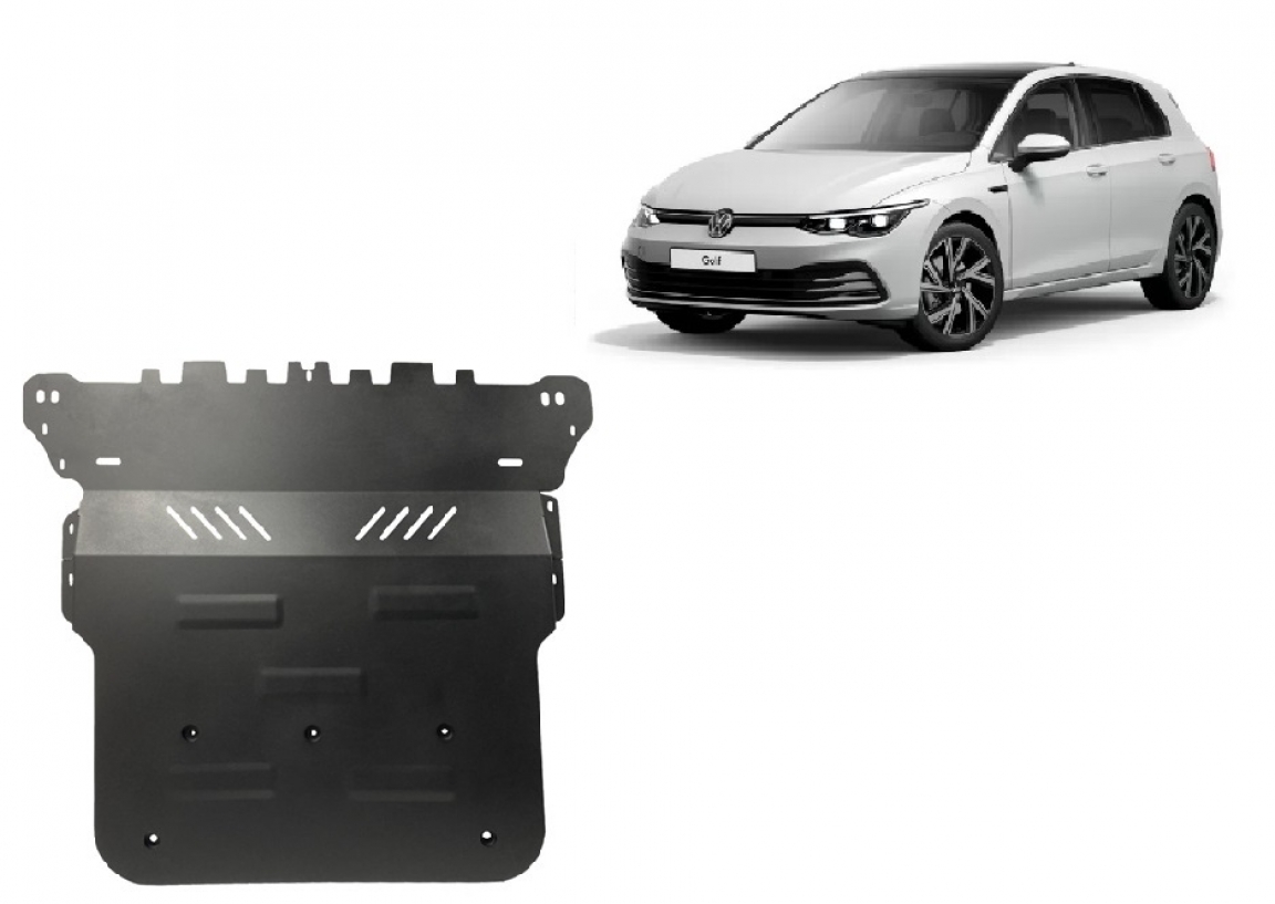 Skid plate for the protection of the: engine, gearbox, radiator The skid plate is new and fits perfectly for all versions of VW Golf 8 manufactured between 2019 and 2026. Made out of 2 mm thick Steel plate. Screws, nuts, clips, all fastening accessories are included. All skid plates are powder coated to prevent corrosion. The exterior of the skid plate is provided with Steel reinforcements, which increases the resistance to impact. |