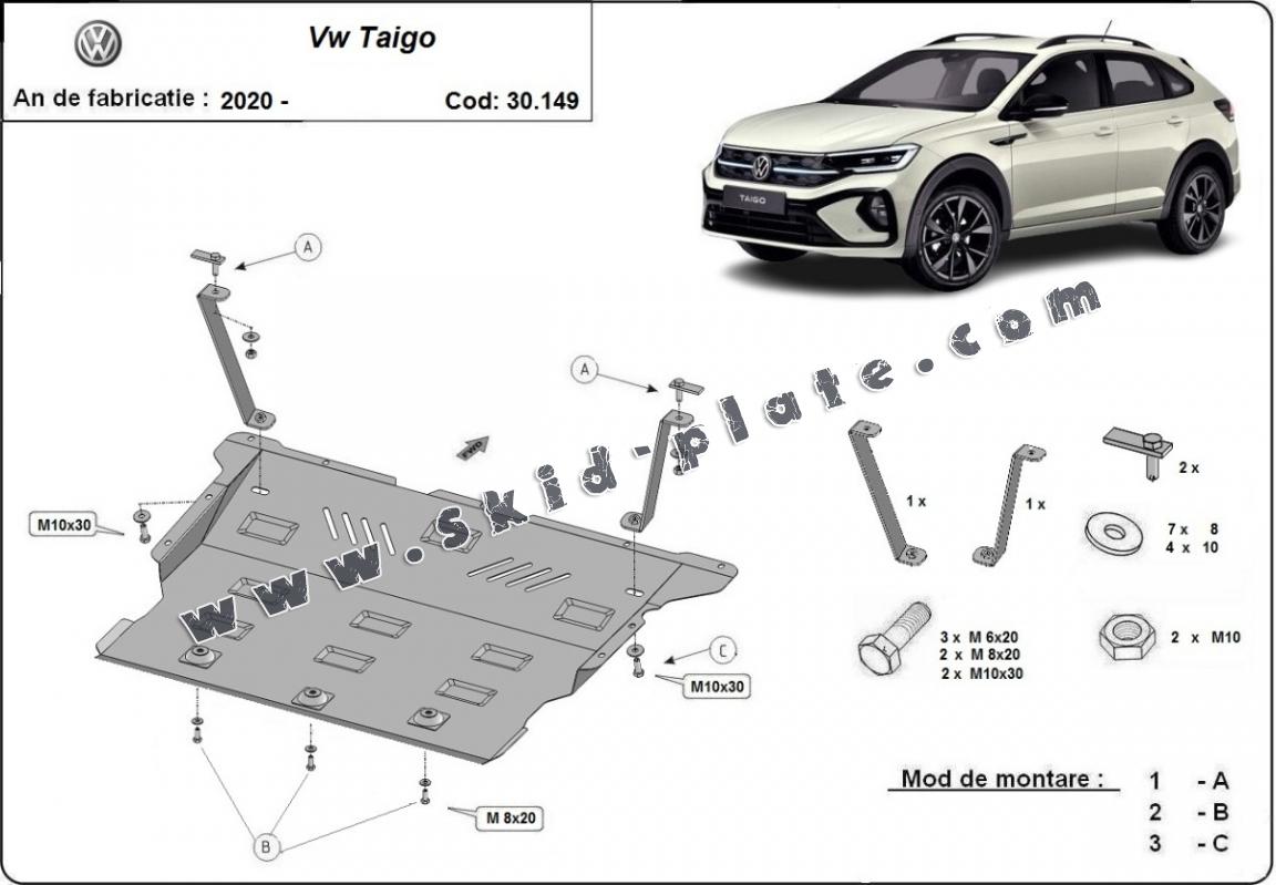 Skid plate for the protection of the: engine, gearbox, radiator, front bumper The skid plate is new and fits perfectly for all versions of VW Taigo manufactured between 2020 and 2026. Made out of 2 mm thick Steel plate. Screws, nuts, clips, all fastening accessories are included. All skid plates are powder coated to prevent corrosion. The exterior of the skid plate is provided with Steel reinforcements, which increases the resistance to impact. |