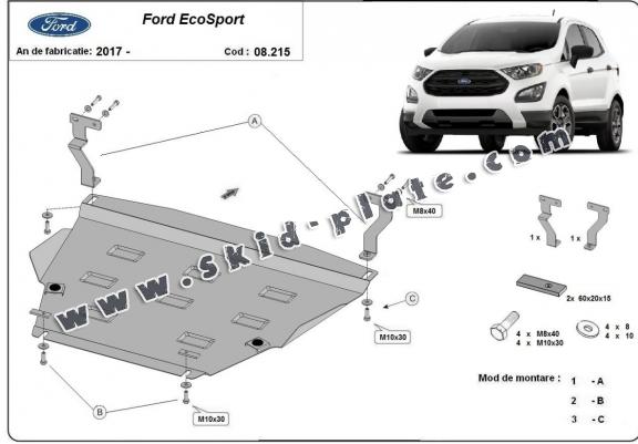 Skid plate for the protection of the: engine, gearbox, radiator The skid plate is new and fits perfectly for all versions of Ford EcoSport manufactured between 2017 and 2026. Made out of 2 mm thick Steel plate. Screws, nuts, clips, all fastening accessories are included. All skid plates are powder coated to prevent corrosion. The exterior of the skid plate is provided with Steel reinforcements, which increases the resistance to impact. |