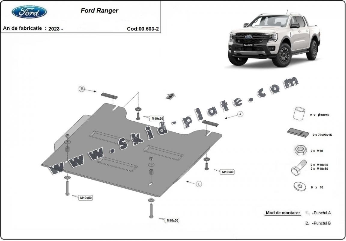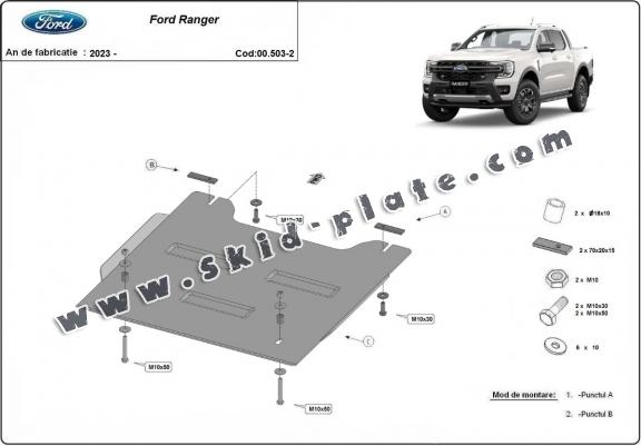 Skid plate for the protection of the: Transfer case The skid plate is new and fits perfectly for all versions of Ford Ranger manufactured between 2023 and 2026. Made out of 3 mm thick Steel plate. Screws, nuts, clips, all fastening accessories are included. All skid plates are powder coated to prevent corrosion. The exterior of the skid plate is provided with Steel reinforcements, which increases the resistance to impact. |